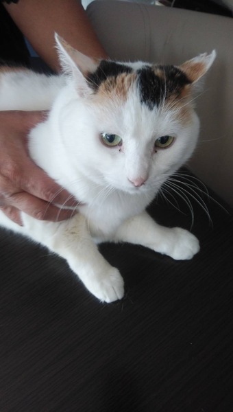 | 特徴(性格など) | 人慣れしていて白が多い三毛猫です。 尻尾が真っ直ぐで尻尾に柄があります。 サクラ耳になってます。 宜しくお願い致します。 |