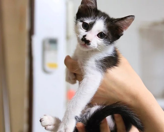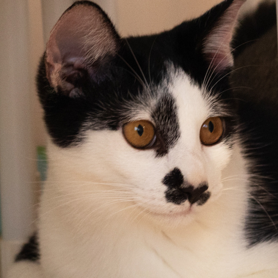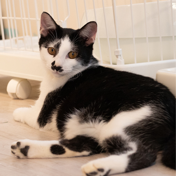 | 特徴(性格など) | すごく元気な男の子です。鼻の下のちょびひげ模様が愛らしいのと、黒の割合が多めの白黒模様をしています。 猫じゃらしが大好きで、長男のような立ち位置でリーダーシップを発揮しています。 だっこ○、爪切り○、膝のり○です。 |