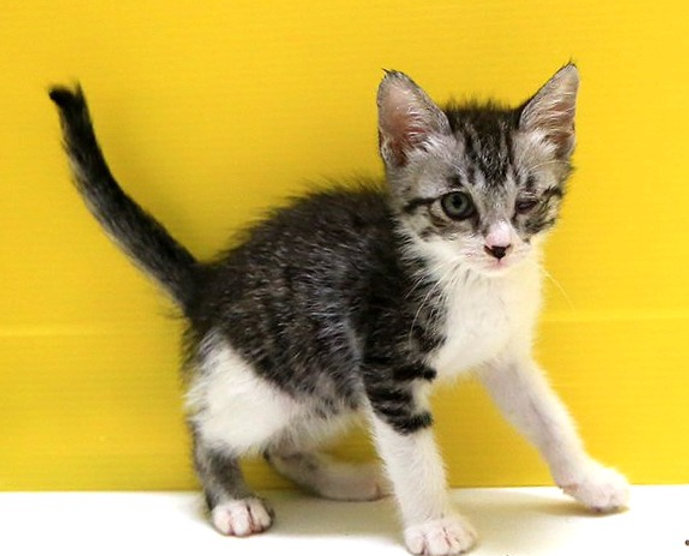 | 特徴(性格など) | 灰色に近いキジ白です。しっぽは慎重にゆっくり触ると細かくウェーブしているのが分かりますが、見た目はほぼまっすぐです。左前足だけ真っ白なのが、なんとなく腕まくりしているみたいです。 残念ながら左目は入所時から癒着しており、今後も開かないと思われますが、日常生活にはまったく支障ありません。 お膝に乗るとすぐグルグル喉を鳴らし、 後頭部やしっぽの付け根を撫でられるのが大好き。人懐っこさ抜群です! |