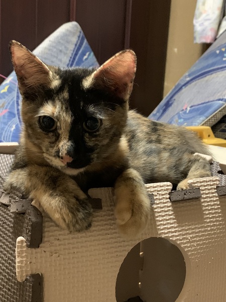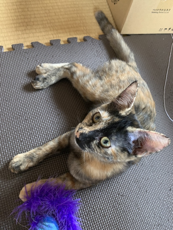 | 特徴(性格など) | お顔半分で分かれた個性的な柄。好奇心旺盛で、肝の座った子。すぐにねーねーと寄って来るようになりました。尻尾は長く真っ直ぐです。 1回目ワクチン10/12 2回目11月予定です。 |