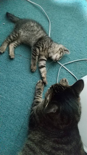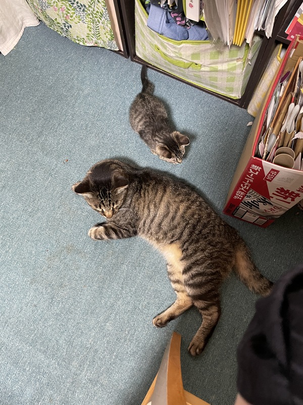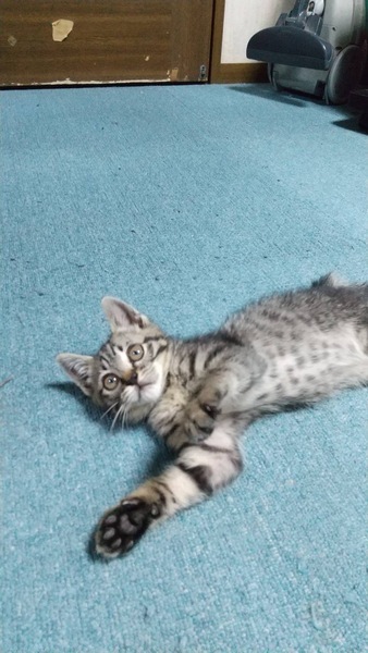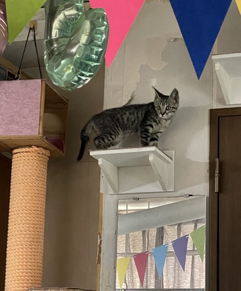 | 特徴(性格など) | ※7/23時点 体重1250g 人慣れはしていませんが、おじいちゃんにだけ懐いてます。 時間を掛ければ、甘えてくれるようになります。 ※7/8時点 体重1000g まだ人慣れしておりませんが、以前よりは警戒心が減りました。 高いところに居る時、下からゆっくり手を差し出すと撫でる事が出来ます。 キジトラ 女の子 6/24診察時 体重600g 健康上問題はなく、体重から1.5ヵ月程度とのことでした。 保護した当時は骨張っていて痩せていましたが、目も綺麗に開いて毛並みも綺麗でしたので数日前まで親猫が近くに居たのかもしれません。 ご飯はウェットフードとカリカリ両方食べます。 まだ人に慣れておらず、近づくと逃げます。 |