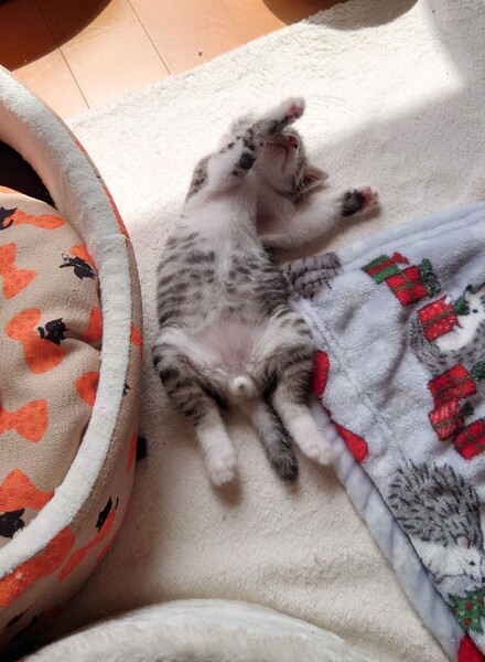| 特徴(性格など) | アメショーのようなくっきりした縞模様。 尻尾はちょっと短めまっすぐです。 兄妹で元気に飛び跳ねながら遊んでいます。 早目に保護したのでみんな人馴れしています。 |