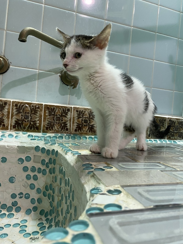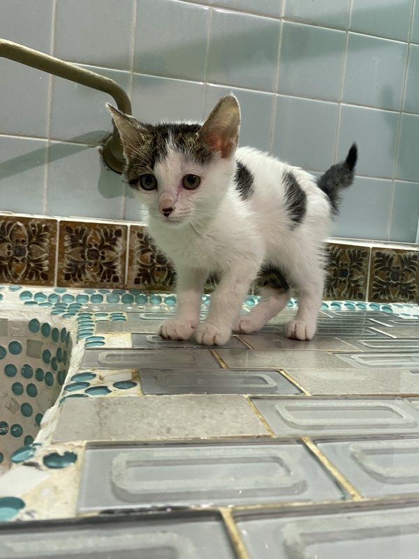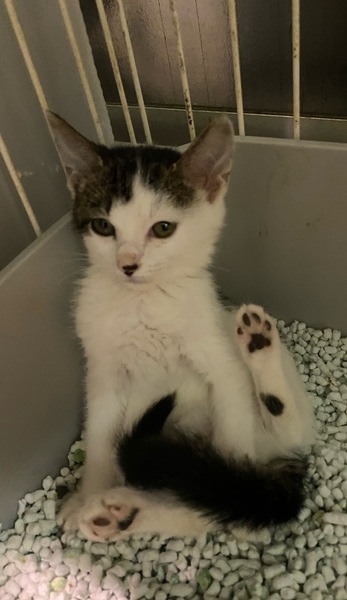 | 特徴(性格など) | 白黒の小さな女の子です。 推定ですが、生後1.5ヶ月くらいということです。兄弟猫と一緒に捨てられ、保護されました。おとなしい、穏やかな子です。 |