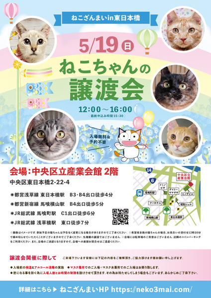 | その他(譲渡条件など) | 11:30より、2階会場入口にて受付を開始します。 受付時に入場予定時間が記入された整理券をお配り致しますので、整理券を受け取った方はお時間になりましたら2階会場入口に番号順にお並び下さい。 ※11:30より早くいらしてもお待ちいただく場所がございません。 また、近隣にお住まいの方や他階フロアのご利用者様にご迷惑となる場合がございますので、受付開始時間にあわせてお越しくださいますよう、何卒ご協力お願いいたします。 ※ねこざんまい譲渡会は、先着順で里親様を決定する譲渡会ではありません。 先に申し込みをした方を優先することもありません。 お話をして、その猫ちゃんに合ったおうちに決めさせていただいております。 12時に開場し、里親様の決定は14時以降となります。 14時以降にご入場の場合、希望の猫ちゃんが決定している可能性があります。 また1頭に対し多数のご希望をいただいた場合、早めに申し込みを締め切らせていただく場合がございますので、予めご了承下さい。 里親様決定は14時以降となります。 その後、迎え入れ準備の説明等のお時間も頂戴しますので、お時間に余裕を持ってご来場下さい。 【新型コロナウィルス感染予防対策について】 譲渡会開催に際し、ご来場下さいます皆様には以下の内容をご理解頂き、ご協力頂けます様お願い申し上げます。 ●入場前の検温とアルコール消毒の実施 ●マスク着用でのご入場=マスク未着用でのご入場はお断り致します ●入場人数の制限をさせていただきます(来場多数の場合は入れ替え制となります) ●時間と人数の制限=密になる事を防ぐ為に入場人数とお時間の制限を設けさせて頂きます その為お待たせしてしまう場合もございます ●会場利用規約により、ご来場者様の連絡先を控えさせていただきます あらかじめご了承下さい。 諸々の制限がございますが、安心・安全な譲渡会運営のためにご理解・ご協力いただきますようお願い申し上げます。 ~~~~~~~~~~~~~~~~~~~~~~~~~~~~~~ ★仔猫ご希望の里親様★ 仔猫ちゃんたちは、まだ体がしっかりしていない赤ちゃんです。 下痢だけでも数時間対応ができなかっただけ死に至る事もあります。 その為、月齢に応じたお留守番時間を設けさせていただいております。 また、子猫ちゃん(6ヶ月未満)の里親様には子猫支援金のご協力をお願い致しております。 ★猫ちゃんとのお見合いは譲渡会で!★ ねこざんまいの猫ちゃんは譲渡会でのお見合いのみとなります。 『この子はいつ譲渡会に参加するの?』『譲渡会場の場所はどこ?』などは、ねこざんまいホームページをご覧ください。 https://neko3mai.com/ ★楽しく猫ちゃんと触れ合って★ ねこざんまい譲渡会は、猫ちゃんも里親様も保護主も笑顔で過ごせる譲渡会を目指しています。 これから20年以上、楽しい時も、悲しい時もいつも傍にいてくれる大切な家族になる猫ちゃんです。 会場には沢山の猫ちゃんがいます。 1匹1匹、触れ合って猫ちゃんとお話してください。 『初めて猫ちゃんを家族に迎える方』 『先住猫ちゃんのお友達を迎える方』など トライアルの仕方や先住猫ちゃんと仲良くなるコツなど経験豊富な保護主やスタッフにお気軽にご相談ください! 猫を愛し、そして猫に愛されている猫好きスタッフと保護主がアドバイスさせていただきます。 ★里親希望のみなさまへ★ ペットではなく、家族一員としてたっぷり愛情を注いでくださるご家庭をお待ちしております。 恐れ入りますが ●学生の方、子猫・幼猫希望の60才以上の方のみのご家庭 ●脱走防止対策にご協力いただけない方 は原則譲渡を遠慮させていただいております。 ●一人暮らし・同棲(事実婚)の方 保護主の希望や猫の年齢・性格等により、ご希望に添えない場合もございます。 参加猫ちゃんは、それぞれ保護主(実際に猫ちゃんを自宅に入れ、保護をしている方)が異なります。 詳しい条件なども異なる場合がございますので、会場内で直接保護主とお話ください。 〖共通条件〗 1.終生飼育 2.完全室内飼い 3.脱走防止対策へのご協力 4.避妊去勢手術 5.契約書類へのサイン 6.定期報告 7.医療費等の負担 当日の猫ちゃんを連れて帰ることはできません。後日、保護主が里親様のご自宅までお届け致します。 その為、移動の際の猫ちゃんの負担を月齢などから考慮し、お届け地区を限定させて頂くこともございますのでご了承ください。 ご理解とご協力のほど宜しくお願い致します。 ☆よくある質問☆ ・譲渡の条件 ・ご負担頂く費用 ・譲渡会の場所等は ホームページに詳しく掲載させて頂いておりますのでご覧ください。 https://neko3mai.com/ メールでのお問い合わせはすぐにご返答出来ない場合がございますのでご了承ください。 ホームページ https://neko3mai.com/ お問い合わせ http://www.neko3mai.com/contact/form_general.html ねこざんまいブログ http://ameblo.jp/neko3mai/ |