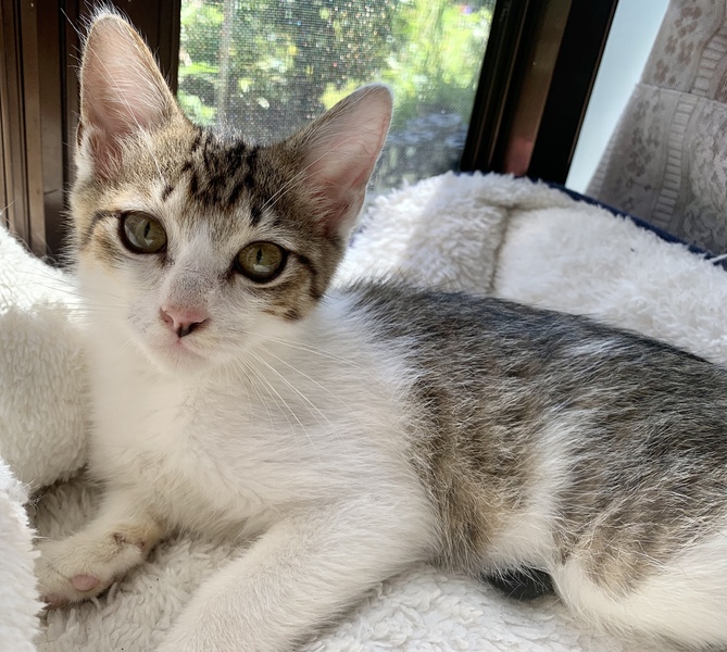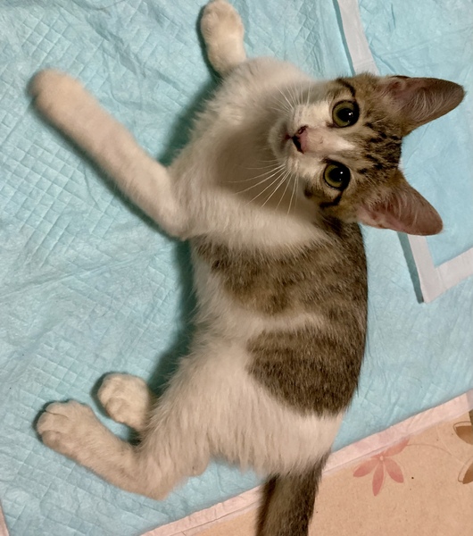 | 特徴(性格など) | 元気いっぱいな男の子です。 トイレは猫砂の中でします。 背中と頭がトラ柄で、わかりにくいですが尻尾の先が曲がっています。 ご飯は、ドライフードも食べられるようになりましたが、ウェットフードの方が好きなようなので、混ぜて与えています。 お腹が空くと鳴いてきます。 我が家では小型犬を飼育していますが、一緒の部屋にいても一度も怖がることはなく堂々としていました。 物音には敏感で、物音がするとビクッとしたり逃げます。 拾った当初は、ダニとノミが体についていましたが、病院を受診し駆除済です。 7/20に受診した際に生後約2ヶ月と言われました。 検便済、FeLV陰性、FIV陰性です。 |