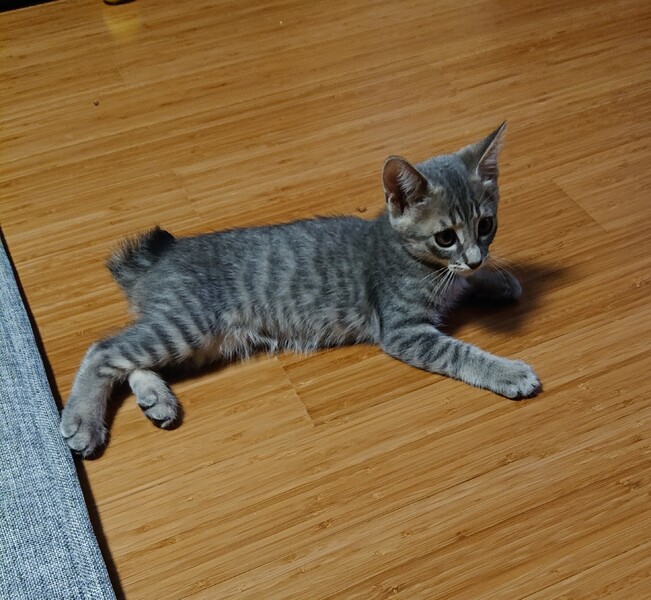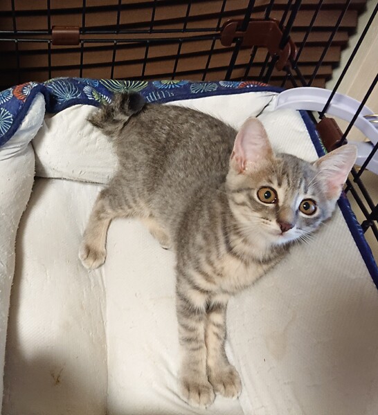 | 特徴(性格など) | さばとらグレーのとっても元気な女の子♀ カギ尻尾短めです。 優しくおとなしいけど、反面お気に入りのオモチャには飛びついて遊びます。 |