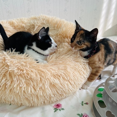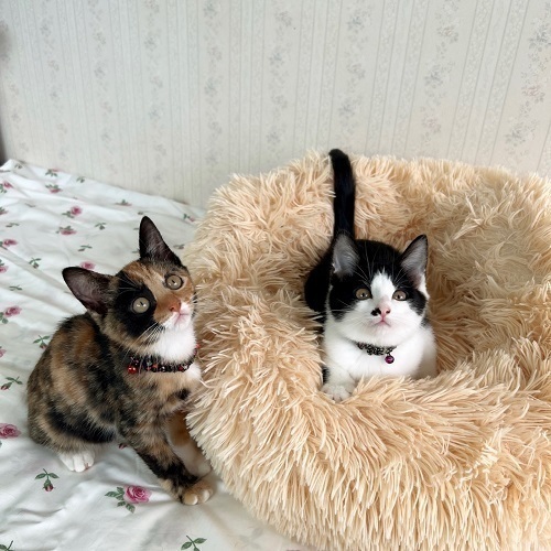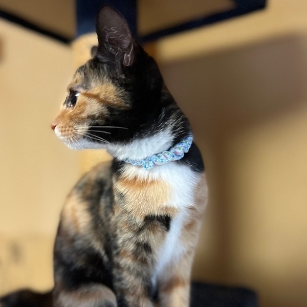 | 特徴(性格など) | 美人系のサビ柄に近い三毛ちゃんです。はちちゃんと姉妹ですが2匹を比べると、何にでも興味を示して物怖じしないチャレンジャータイプです。掃除機も怖がらずむしろ戯れてきます。笑 小さな頃にミルクボランティアさんに育てられたお陰で人馴れがバッチリで、抱き上げるとゴロゴロが止まりません。 いつも人のあとを付いてきて、部屋のドアを開けるとスルッと先を越して入っているので、脱走防止をしっかりしてくださるご家庭を希望します。 姉妹2匹のお迎えも大歓迎です。 |