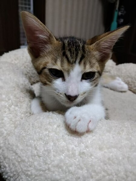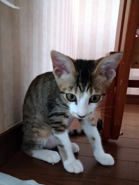 | 特徴(性格など) | 2022.6.4生まれ(推定) 毛色:キジ白 細長いしっぽのキジ白の女のコ。 スリムなカラダで毛玉ボールをくわえて走り回ったり、転がして遊んだりします。 他の子猫たちとニャ~ニャ~いいながらニャンプロします。 人が横になるとくっついてきて添い寝したり、ひざの上でお昼寝したりもします。 夜寝る時はベッドの端っこをチュパチュパしながら眠ります。 |