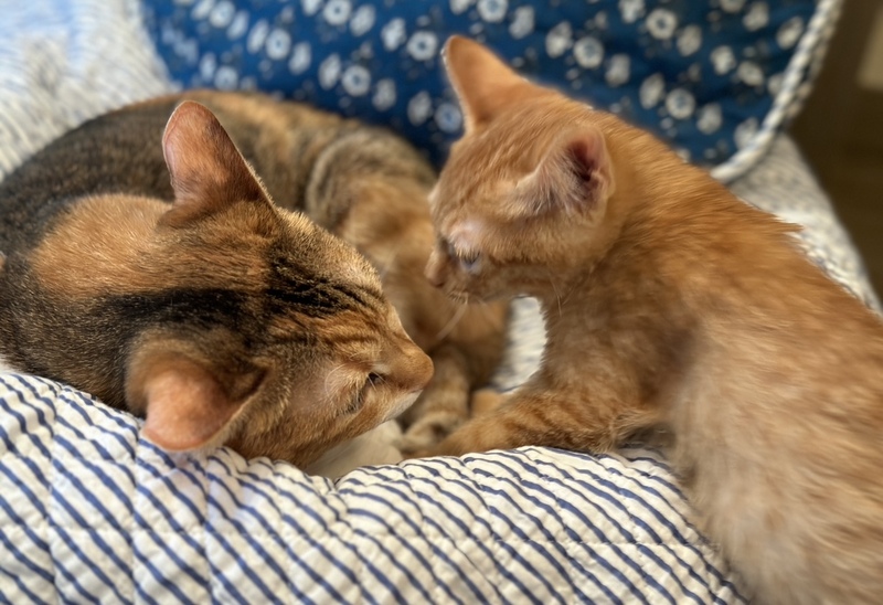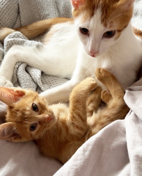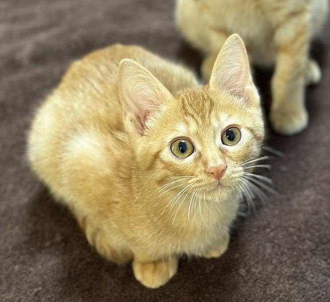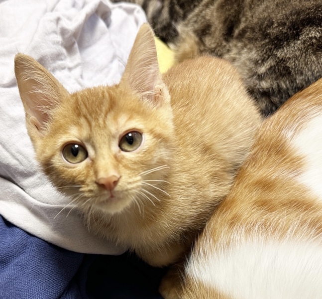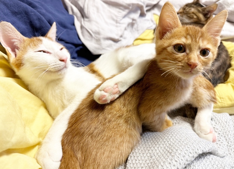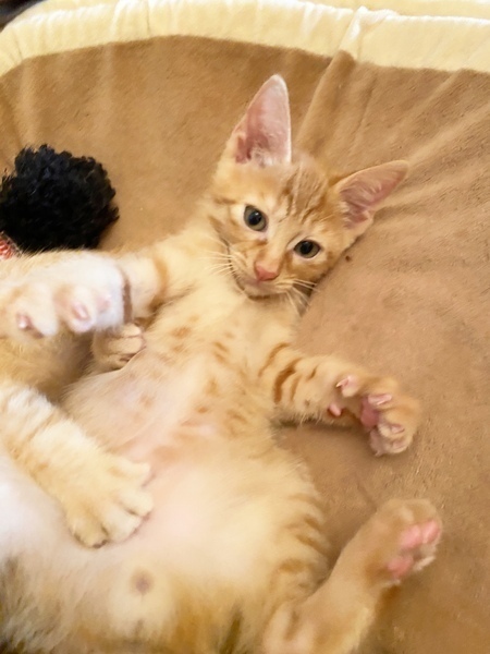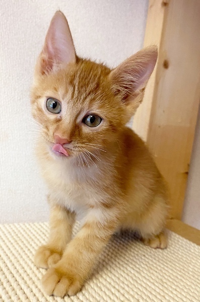 | 特徴(性格など) | *特徴 全身はちみつ色の王道の茶トラ君です。尻尾はほぼ真っ直ぐでちょっと太めです。 *性格 幼齢で6兄妹が皆一緒に保護されたせいか、警戒心が全く無く、兄妹達と仲良く元気いっぱいに遊んでいます。 遊ぶのが大好きで、オモチャには目がないですし、一緒に過ごしている猫さんたちと取っ組み合いのケンカや追いかけっこが本当に楽しそうです。 ですが、さすが男の子は甘えん坊さんで、ソファに座っているとピタッとくっついてきたり、寝る時も顔の側で一緒に寝ることが多いです。 保護主宅の先住猫さんにも甘えていって、よく可愛がってもらっています。 ちょうど今くらいの時期から4ヶ月くらいまでの間は、子猫さんの社会性が育つ時期になります。取っ組み合いの喧嘩をしながら、甘噛みを覚えたり、追いかけっこしながら、動体視力を養っていきます。 できれば、2頭一緒に迎えてくださるお宅や一緒に遊べる若い先住猫さんがいるお宅、お留守番があまり長くなく猫さんと一緒に遊ぶ時間が十分取れるお宅を優先させていただきたいと考えております。 ご理解くださいますよう、よろしくお願いいたします。 |