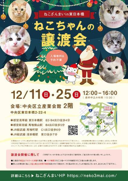 | その他(譲渡条件など) | 11:30より、2階会場入口にて受付を開始します。 受付時に入場予定時間が記入された整理券をお配り致しますので、整理券を受け取った方はお時間になりましたら2階会場入口に番号順にお並び下さい。 ※11:30より早くいらしてもお待ちいただく場所がございません。 また、近隣にお住まいの方や他階フロアのご利用者様にご迷惑となる場合がございますので、受付開始時間にあわせてお越しくださいますよう、何卒ご協力お願いいたします。 ※ねこざんまい譲渡会は、先着順で里親様を決定する譲渡会ではありません。 先に申し込みをした方を優先することもありません。 お話をして、その猫ちゃんに合ったおうちに決めさせていただいております。 12時に開場し、里親様の決定は14時以降となります。 14時以降にご入場の場合、希望の猫ちゃんが決定している可能性があります。 また1頭に対し多数のご希望をいただいた場合、早めに申し込みを締め切らせていただく場合がございますので、予めご了承下さい。 里親様決定は14時以降となります。 その後、迎え入れ準備の説明等のお時間も頂戴しますので、お時間に余裕を持ってご来場下さい。 【新型コロナウィルス感染予防対策について】 譲渡会開催に際し、ご来場下さいます皆様には以下の内容をご理解頂き、ご協力頂けます様お願い申し上げます。 ●入場前の検温とアルコール消毒の実施 ●マスク着用でのご入場=マスク未着用でのご入場はお断り致します ●入場人数の制限をさせていただきます(来場多数の場合は入れ替え制となります) ●時間と人数の制限=密になる事を防ぐ為に入場人数とお時間の制限を設けさせて頂きます その為お待たせしてしまう場合もございます ●会場利用規約により、ご来場者様の連絡先を控えさせていただきます あらかじめご了承下さい。 諸々の制限がございますが、安心・安全な譲渡会運営のためにご理解・ご協力いただきますようお願い申し上げます。 ~~~~~~~~~~~~~~~~~~~~~~~~~~~~~~ ★仔猫ご希望の里親様★ 仔猫ちゃんたちは、まだ体がしっかりしていない赤ちゃんです。 下痢だけでも数時間対応ができなかっただけ死に至る事もあります。 その為、月齢に応じたお留守番時間を設けさせていただいております。 また、子猫ちゃん(6ヶ月未満)の里親様には子猫支援金のご協力をお願い致しております。 ★猫ちゃんとのお見合いは譲渡会で!★ ねこざんまいの猫ちゃんは譲渡会でのお見合いのみとなります。 『この子はいつ譲渡会に参加するの?』『譲渡会場の場所はどこ?』などは、ねこざんまいホームページをご覧ください。 https://neko3mai.com/ ★楽しく猫ちゃんと触れ合って★ ねこざんまい譲渡会は、猫ちゃんも里親様も保護主も笑顔で過ごせる譲渡会を目指しています。 これから20年以上、楽しい時も、悲しい時もいつも傍にいてくれる大切な家族になる猫ちゃんです。 会場には沢山の猫ちゃんがいます。 1匹1匹、触れ合って猫ちゃんとお話してください。 『初めて猫ちゃんを家族に迎える方』 『先住猫ちゃんのお友達を迎える方』など トライアルの仕方や先住猫ちゃんと仲良くなるコツなど経験豊富な保護主やスタッフにお気軽にご相談ください! 猫を愛し、そして猫に愛されている猫好きスタッフと保護主がアドバイスさせていただきます。 ★里親希望のみなさまへ★ ペットではなく、家族一員としてたっぷり愛情を注いでくださるご家庭をお待ちしております。 恐れ入りますが ●学生の方 子猫・幼猫希望の60才以上の方のみのご家庭 ●脱走防止対策にご協力いただけない方 は原則譲渡を遠慮させていただいております。 ●一人暮らし・同棲(事実婚)の方 保護主の希望や猫の年齢・性格等により、ご希望に添えない場合もございます。 参加猫ちゃんは、それぞれ保護主(実際に猫ちゃんを自宅に入れ、保護をしている方)が異なります。 詳しい条件なども異なる場合がございますので、会場内で直接保護主とお話ください。 〖共通条件〗 1.終生飼育 2.完全室内飼い 3.脱走防止対策へのご協力 4.避妊去勢手術 5.契約書類へのサイン 6.定期報告 7.医療費等の負担 当日の猫ちゃんを連れて帰ることはできません。後日、保護主が里親様のご自宅までお届け致します。 その為、移動の際の猫ちゃんの負担を月齢などから考慮し、お届け地区を限定させて頂くこともございますのでご了承ください。 ご理解とご協力のほど宜しくお願い致します。 ☆よくある質問☆ ・譲渡の条件 ・ご負担頂く費用 ・譲渡会の場所等は ホームページに詳しく掲載させて頂いておりますのでご覧ください。 https://neko3mai.com/ メールでのお問い合わせはすぐにご返答出来ない場合がございますのでご了承ください。 ホームページ https://neko3mai.com/ お問い合わせ http://www.neko3mai.com/contact/form_general.html ねこざんまいブログ http://ameblo.jp/neko3mai/ |