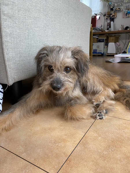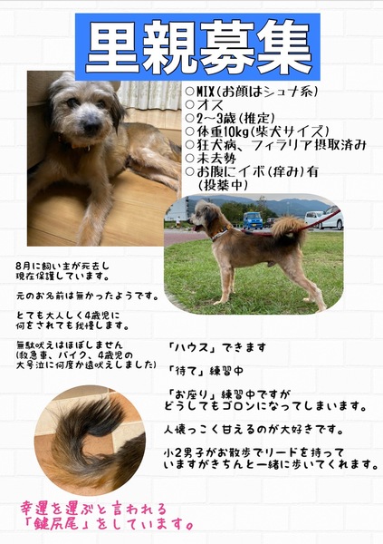| 特徴(性格など) | 体重10kg、背高40cm程の小さめの中型犬です。 少し怖がりなところがあるので保護した直後はビクビクしており、不安から夜中に夜鳴きすることもありましたが数日すると獣医さんも「同じ犬とは思えない」と驚く程に慣れ、今では私の後ろをずっとついてまわる様になりました。 ムダ吠えも無いと言っていい程に無くなり、散歩中に他の犬に吠えかかられた時にたまに数回吠え返す程度で吠えないことが殆どです(3歳の娘がゲージの前で大泣きしていると稀に弱々しく遠吠えして慰めることはありますが…) 家族だけでなく、他の人や犬に噛みつくことはもちろん、歯を剥くことは今まで一度もありません。 今は室内飼いにしてますが基本的に外でしかトイレをしないので朝晩1〜2回の散歩だけで家の中で粗相をしたことはありません(天気が悪い日等は近くでトイレだけさせてます) 保護した時からお腹にイボがあり、獣医を受診したところ良性とのことですが、痒みがあるようで搔いてしまうので痒み止めの処方を受けてます。 |
