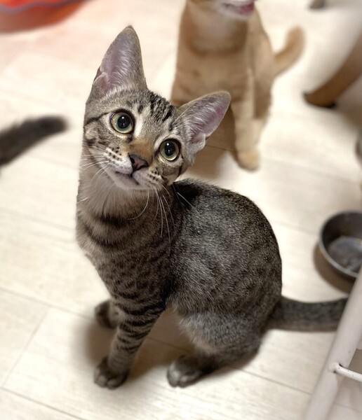 | 特徴(性格など) | くりくり大きなたれ目・てんてんスポットしましま男の子 環境に慣れるまでしばらく時間が必要です。 レトルトご飯が大好き・準備をしているとわくわく過ぎて、こっちを見ながらずっとゴロゴロふみふみしています。 ちょっと怖がりさんですがオモチャで遊ぶのが大好きで、ねこじゃらしを振ると全力で一生懸命です。 今の所は抱っこは苦手の撫でられ好きです。 |