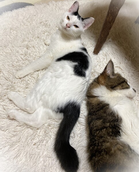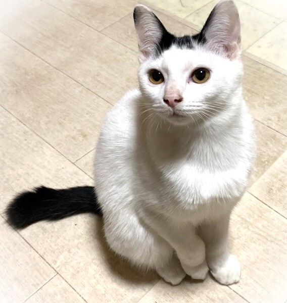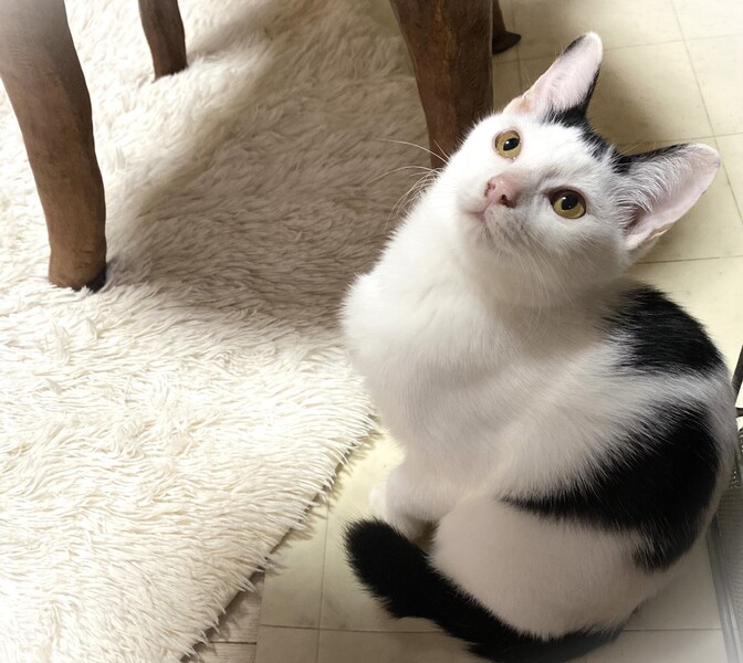 | 特徴(性格など) | 短く切りそろえた前髪・ほんの少し短いしっぽ・ちょっとだけ長めの被毛の影響で全体的にまるこい印象 白黒女の子 環境に慣れるま時間が必要です。 元々やんちゃで遊び好き。 カサカサ音が好きで、お気に入りのペットボトルのキャップや小さいキーホルダーなんかを口にくわえたまま部屋中を移動して遊んでいます。 くりくりの目をしていますが、よく渋い表情をしていたりして見ていて楽しい子です。 |