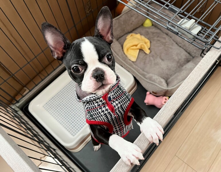 | 特徴(性格など) | ※きちんとしたブリーダーさんからお譲りいただいた仔犬です。(血統書はお渡しできません) ■サイズ 体重は現在4キロ程度ですので成犬時の予想はボストンテリアでは小さ目でライト級の6キロ前後だと思います。 ■これまで行った医療 マイクロチップ装着・混合ワクチン・狂犬病ワクチン・フィラリア・ネクスガード・フロントライン 健康診断・検便 ■性格と特徴 ・カラーは黒白でボストンカラーです。 ・誰にでもとても人懐っこく甘えたがりで懐きやすい性格です。 ・おトイレは毎回、網のガードがあるタイプできちんとします。 ・無駄吠え、チャイム吠えはありません。 ・食欲旺盛でなんでも食べます。まだ寝てる時間が多いです。パピーですので時々食糞することがあります。 ・お散歩デビュー済ですが諸事情でいろいろな経験がまだまだ少ないです。これは徐々に慣れていくと思います。 ・お外に出るのが大好きです。 ・普段は穏やかな仔ですがボストンテリアの特徴で害はありませんがたまにスイッチが入ると思いっきり走り回ります。逆にそれがとても可愛い部分ですのでその特性をご理解いただける方が希望です。 |