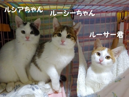 | 特徴(性格など) | 丸顔が可愛い兄弟です キジ白♀ おっとりした性格です 白黒♀ 怖がりな性格でシャーが出ますが撫でる事は出来ます 人慣れ修行中 茶シロ♂ 慣れて撫でると気持ち良さそうにしています 猫じゃらし大好き!丸顔の可愛い兄弟です 先住猫さんがいらっしゃらない場合は兄弟で迎えて頂けると嬉しいです ノミダニ駆除済み エイズ白血病検査陰性 検便済み |