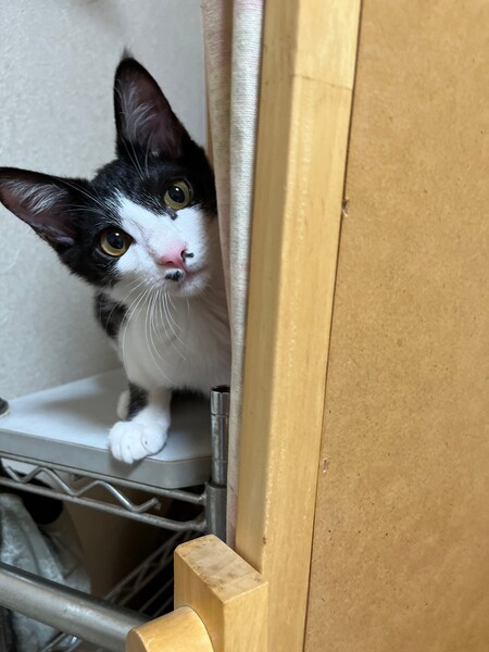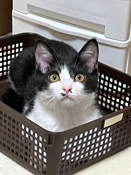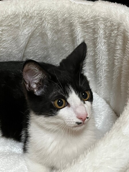 | 特徴(性格など) | 2022.9.20生まれ(推定) 毛色:白黒 これぞ、末っ子の男の子! お姉ちゃん達の後ろに隠れていますが、オヤツやおもちゃをみると1番に飛んできます。 遊びも1番激しいです。 左右対称の綺麗なハチワレ君。 よく鼻水出てる〜(笑)と言われます。 でも左側のホクロ、角度によっては♡に見えて可愛いです。 |