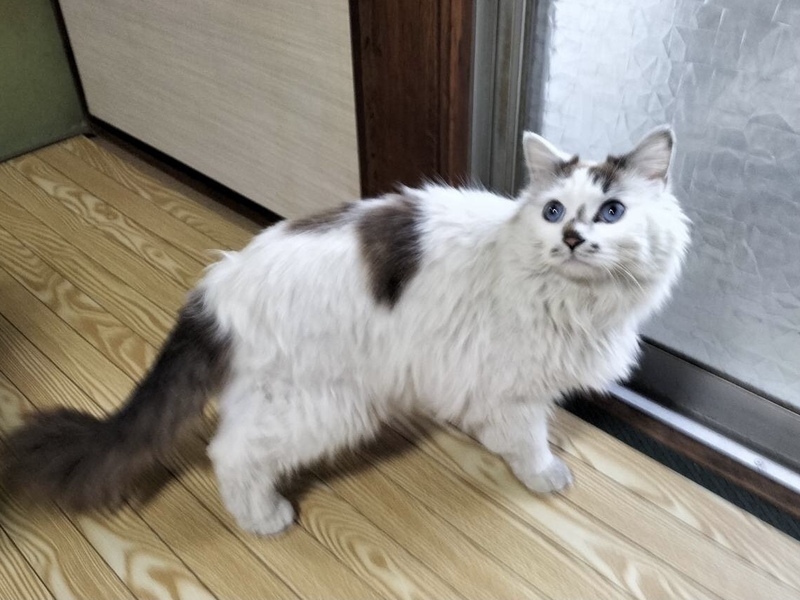| 特徴(性格など) | とても元気です。 白にベージュとブラウンの模様が少しあります。 長毛でふわふわでとても可愛いです。 尻尾も長くきれいです。 人懐っこく、膝に乗ったり甘えんぼです。 エイズ、白血病血液検査、両方共陰性です。 |