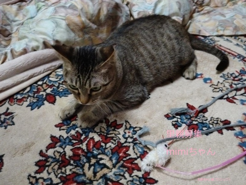 | 特徴(性格など) | キジトラ猫、女の子、仮名:ミミちゃん 推定生後1歳くらい、体重:2.5kg(12/17現在)、 健康診断済み、駆虫済み(ブラペクト2/19)、 血液検査-エイズ・白血病-共に陰性(12/17)、 三種混合生ワクチン接種(2023年2/19)、 不妊手術済み(2023年2/19)、 トイレしつけ済み 人なつっこくて、よく遊ぶ元気な子です。 |