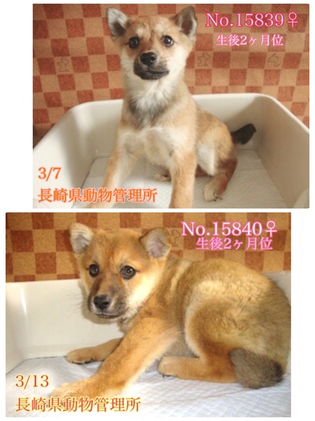 | 里親募集する理由 | ♡まだ生後3ヶ月位弱位、野良ちゃんが生んだ雑種の子犬、とても臆病な可愛い姉妹がご縁を待っていますฅ•ﻌ•ฅ 人と接した経験が無く、撫でられたり触れ合ったり人からの当たり前の愛情、優しさを知らないまま、お腹を空かせて寒いお外で必死に生きてきました。 突然親犬と離れ離れになり連れて来られて収容されどんなに寂しく心細いか。 一日も早く温かい家庭の中で過ごさせてあげたいです。 ⭐️県外、遠方の方でも譲渡の条件が合い、良縁に恵まれましたら里親になっていただけますのでどうぞ宜しくお願い致します! ※ ※ ※ 長くなりますが犬猫と里親様の幸せの為にも、募集内容を熟読し、必ずご家族とよく相談をされた上、ご家族全員の賛同を得られてからのお問い合わせ をお願い申し上げます※※※ ⭐️ 外飼いでは無く、室内飼育で家族の一員として迎えて下さる方、「引き渡し方法」のところにあります【①〜のアンケート】にご回答と、No.どちらの子をご希望か、と共に、お問い合わせを頂けますようお願い申し上げます♡ 長崎県の離島、壱岐市石田町内にて3/13に壱岐保健所に保護され、現在は長崎県動物管理所へ移送されてきています。この地域は野犬が多く、周りに民家の少ない山の中です( ; ; ) 無理もありませんが知らない場所、初めての環境でまだかなり怯えて怖がっています。 優しい職員さん方が大丈夫だよ、幸せになれます様にと毎日触れ合い、声掛けしながら一生懸命にお世話してくださっています。 ♡No.15839 焦げ茶の女の子 ♡No.15840 茶色の女の子 撫で撫でしてもひたすらジーっと大人しく固まって怯えていて、ただただ怖くてたまらない様子、必死に気配を消している感じでうずくまっています。 抱っこすると恐怖心からお漏らし、脱糞で、必死に逃げたくて放してよと言うように自分を守る為に噛もうとしてしまいます(>_<) 段々と人の目を見てくれるようにはなってきましたが人との関わりや新しい環境に馴れるまではまだ暫く時間を要するかと思われますm(_ _)m ご飯も人前では食べず、ちゅーるも食べようとせず、人が居なくなってから食べている状況です。 栄養不良に不衛生な環境からの保護・収容で、痩せていましたしノミダニがついていました(><) 毛艶も悪く、栄養状態や健康状態がいいとは言えません。 体調も急変しやすいかと思われます(>_<) 何か病気や障害が有るのか、無いのかも分かりません。。 ★今後、体調の急変などもあり得ることを念頭に置き、譲渡後は早急な病院受診が可能なご家庭を希望しておりますm(_ _)m 現在は1日に2回、ご寄付で送って頂いた栄養価の高い良質な仔犬用のドライフード(ネイティブドッグフードパピー)を食べています。 まだまだ幼い為、長時間のお留守番は出来ません。 特に子犬は不安や寂しさから夜鳴きする子も多いです。 ※今後の健康な成長の為に良質なフードを与える事が可能な方。 ※大事な社会化期で、これから甘噛み期やトイレの躾など、何かと手がかかりますが育てる自信と覚悟のある方。 出来ればこのような野犬の飼育経験のある方が望ましいですm(_ _)m ※子犬は思っていた以上にお世話が大変だと言われる方が多く、排泄も頻回で甘噛み期もあります。カミカミされると痛いです! この子達は甘噛み以前に、怖さで噛むので本当にご苦労もかなり多いと思います( ; ; ) 日に日に大きくなっていきますし、換毛期は抜け毛もわんさか、日々のブラッシングも必要です。 本当に!大変ですが( ; ; )充分ご理解頂ける方m(_ _)m まだお散歩デビューは出来ませんが怯えている事もありますし、今後成長していく中で、急な物音や知らない場所にビックリして怖がって、咄嗟に逃げよう、逃げようとする可能性も大いにあり得る事だと思います。 その時の力、引きの強さも想定し、急な走り出しや高い塀や壁・柵の飛び越え・急な方向転換や首を振って後退りからの首輪抜け、胴輪抜けにはご用心です! 呼び戻しも教えなければなりませんし、パニックになったワンちゃんには呼び戻しもききません、もし逃がしてしまったらピューっと走って逃げて行ってしまう可能性大です!(>_<) もし逃がしたらもう捕まえられない!というようにお考えくださいm(_ _)m ※繰り返しになりますがどんな子であっても、慣れてきても常に、脱走・逃走には充分な注意と最大限の配慮(二重扉、W首輪、胴輪にWリード)そして、迷子札の装着 をお願いしております。 適切に制御し、躾や毎日朝晩のお散歩、運動の時間をしっかり取ることの出来る、沢山優しく触れ合って頂ける方。 先ずはこの子達が心を開いていけるようじっくりと時間を費やし触れ合い、信頼関係を作っていく事の出来るご家庭を希望しております。 ♡人間が焦らずにゆっくり見守りながら、愛情を持って接ししっかりとお散歩にも連れ出して行けば、きっと徐々に新しい家庭に馴染んでいける、本当は優しい家族に囲まれて思い切り甘えて遊んでほしいのだと思いま