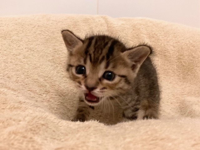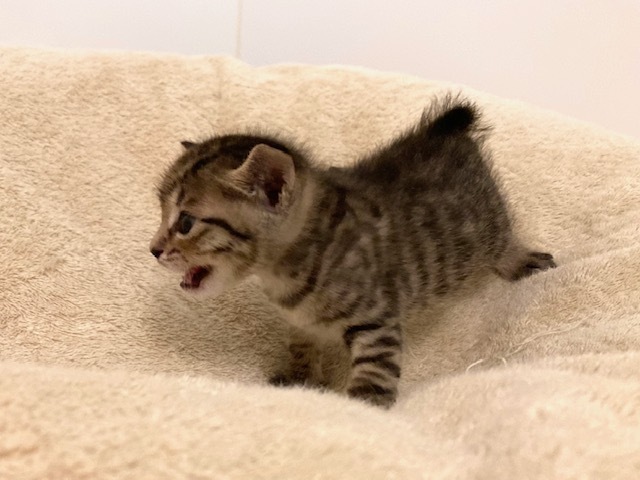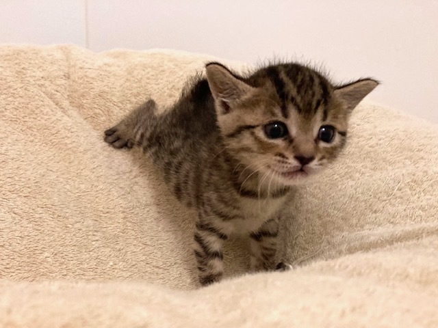 | 特徴(性格など) | 性格・特徴 冴(さえ)ちゃん:推定4月15日頃生まれ。キジトラの女の子。1㎝くらいのとても短いしっぽです。一緒に保護された樹(いつき)ちゃん、椛(もみじ)くんと一緒に元気いっぱい遊び、猫同士の社会性を学んでいます。人懐こく、目が合っただけでゴロゴロと喉を鳴らして近寄ってきます。 健康状態 目が開きかけの状態で保護しました。当初は目ヤニが少し出ていましたが、目薬で治りました。獣医さんの診察の結果、現時点で骨格や心音も問題ありませんでした。 まだ小さいので多くの医療処置はこれから行います。現在は徐々にミルクを卒業しつつあり、少しずつ離乳食にトライしています。トイレトレーニングも行っており、ほぼ失敗なく猫砂でトイレができるようになってきました。シャンプーと爪切りは問題なく行うことができています。 【現在までに行った医療処置やケア】 ・シャンプー ・爪切り ・目薬投与 ・獣医師による身体検査:特に異常なし 【今後行う予定の医療処置やケア】 ・検便(日をずらして合計3回行う予定) ・ネクスガード(ノミ、マダニ、フィラリア、回虫、条虫等の駆除・予防)投与 ・猫3種ワクチン(第1回目) ・マイクロチップ装着 ※猫エイズ・白血病の検査に関しては、生後6か月以下ですと正しい検査結果が出ない可能性(擬陽性・疑陰性)があるので行いません。 引き渡し方法 お渡しは6月中旬以降の予定です。詳細条件ご確認、お見合い(当方までお越しいただきます)の終了後、双方合意の上で譲渡が決定しましたらご自宅までお届けに参ります。 【今後の予定】 5月下旬: 里親様応募締め切り、条件確認ご連絡 6月上旬~中旬頃: お見合い、正式譲渡決定 6月中旬以降: お届け、トライアル ※あくまで予定です。子猫の健康状態やその他事情によって変更の可能性があります。 |