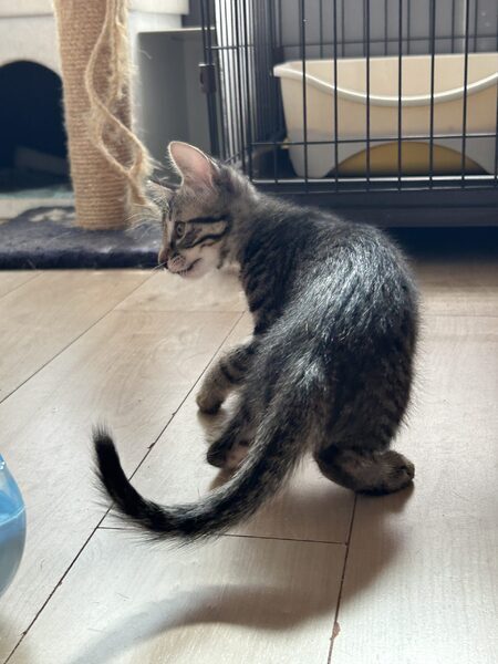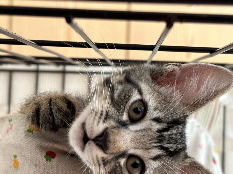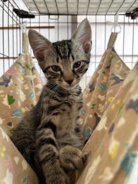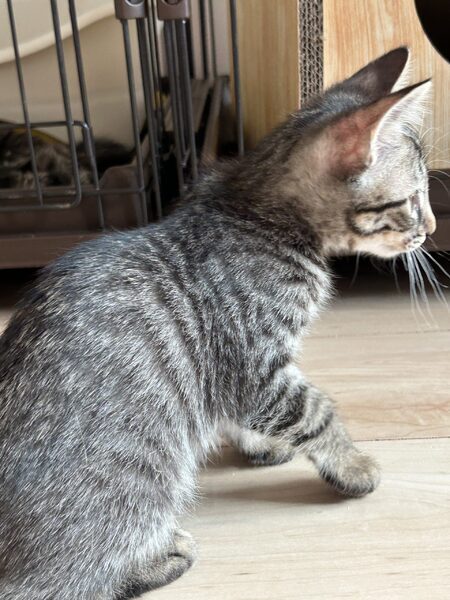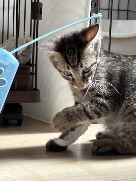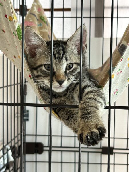 | 特徴(性格など) | 保護された妊婦猫から産まれました。4匹兄弟。ハンモック好き。いつでも握手会やってるよー。ママはモフモフ毛が長いんだけど、ボクは長く無いんだ。華奢に見えるけど、結構しっかりしてるんだよ。身軽にぴょんぴょん走り回っています。1匹でも構いませんが、兄弟一緒もご検討ください。ママと一緒もOKです。 |