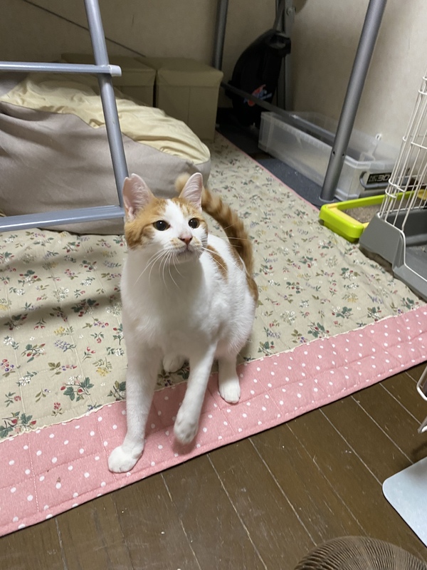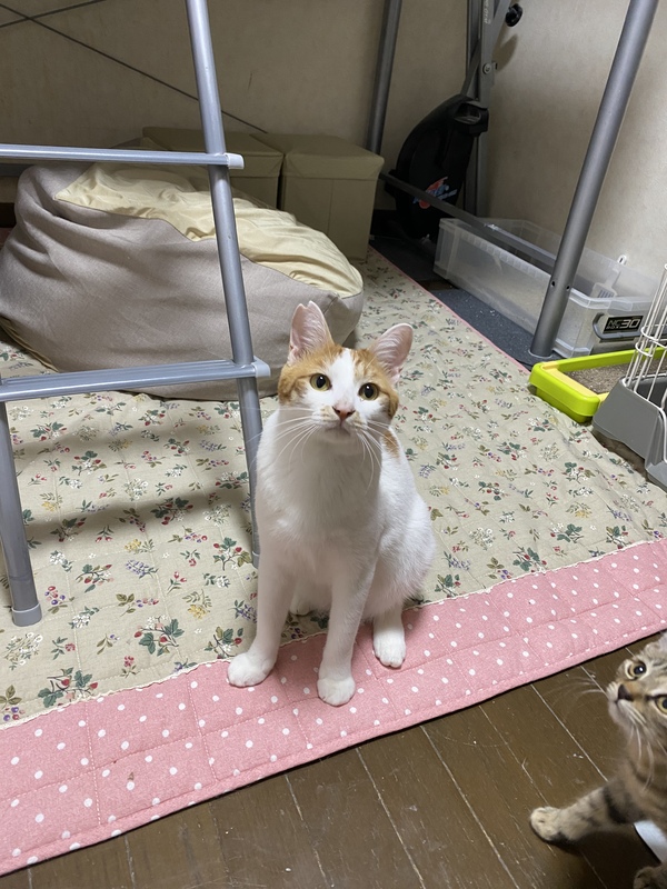 | 特徴(性格など) | 先に募集していた、ぴの、るたおの兄弟猫さんです。食いしん坊で体は大きいですがおっとりしていて穏やかな性格です。 白に茶色のぶち柄です。 |