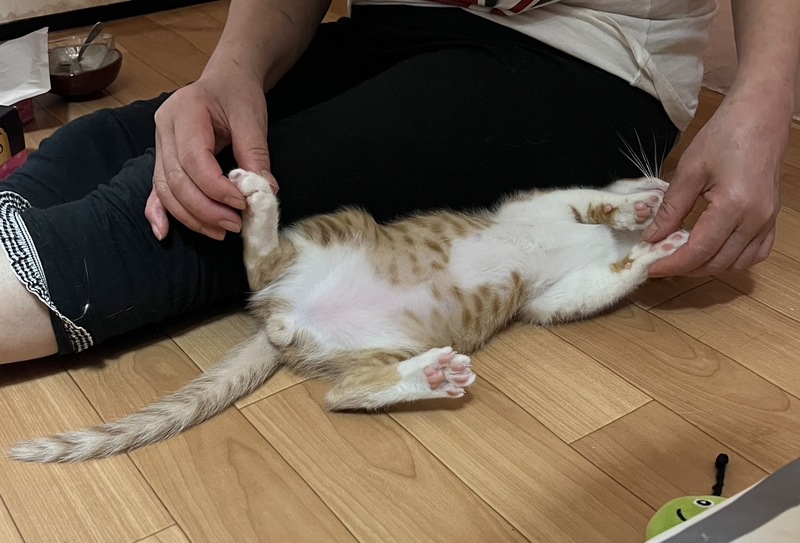 | 里親募集する理由 | 母猫が小さな子猫を連れて工場敷地内にいる。車の工場なので、危険ということで子猫は保護、 母猫はごはんをもらえる家があるので不妊手術をしてもどしました。 |