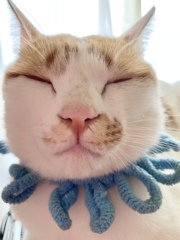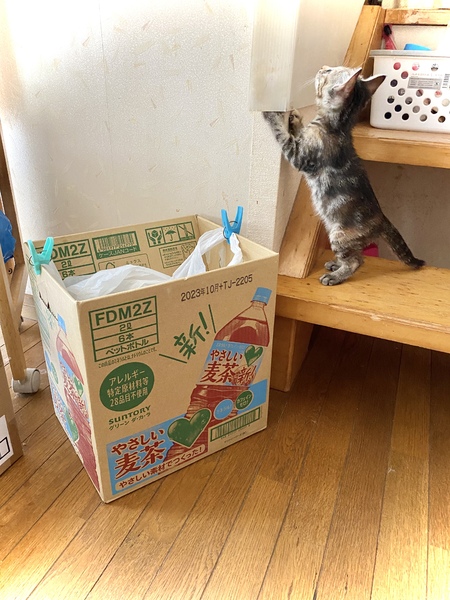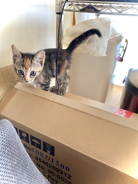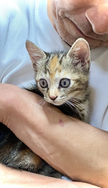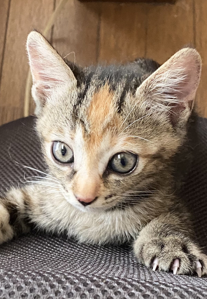 | 特徴(性格など) | いきなり知らない場所に連れてこられたのですから、保護した当初は、怖がっておりましたが、日を増すごとに、慣れて甘えるようになりました。抱かれるとゴロゴロ喉を鳴らします。 与えたおもちゃと、ずっと遊んでくれますから、手がかからず、楽をさせてもらっています笑 我が家の猫の後をひょこひょこついています。 良く食べますから、ガリガリだった体もふっくらして、表情も豊かになり可愛い盛りです。 色柄が、誠に個性的で、 三毛、サビ、キジトラが合わさった柄です。 濃いめのブラウンに、白とオレンジの縞模様が品良く、成長が楽しみでもあります。 ノミダニ駆除済み 便検済み |