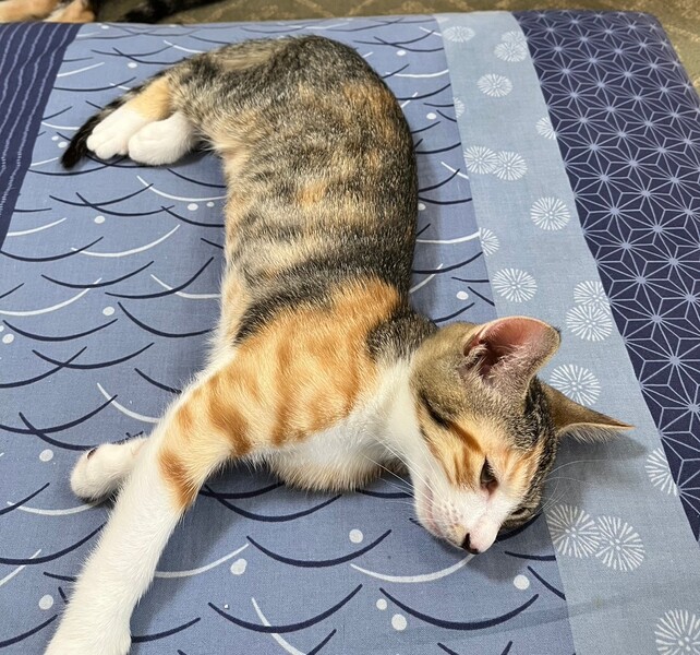 | 特徴(性格など) | 2023.4.16生まれ(推定) 毛色:三毛 ちょっとタレ目の可愛いキジ三毛の女の子。 茶トラも入っている不思議模様です。 甘えん坊でサイレントニャーをしたり、妹マノアの肉球をチュパチュパしたりします。 妹が嫌がると自分の肉球や人の手をチュパチュパ。 遊ぶのも大好き♡ ニャンプロしたり、おもちゃを追いかけたり、激しいです。 |