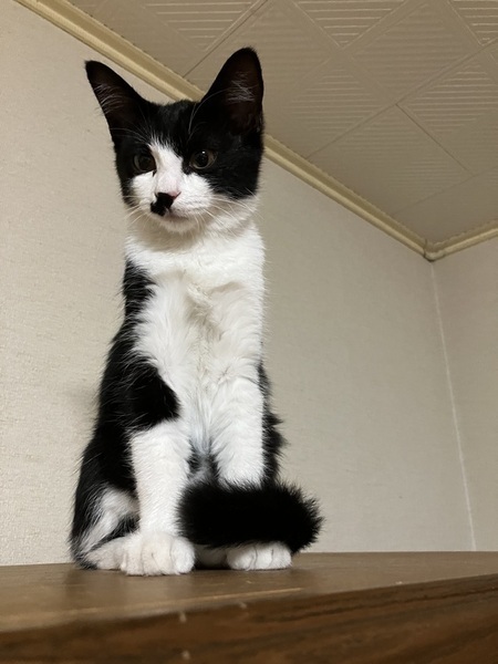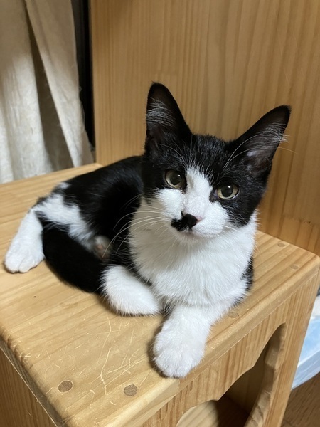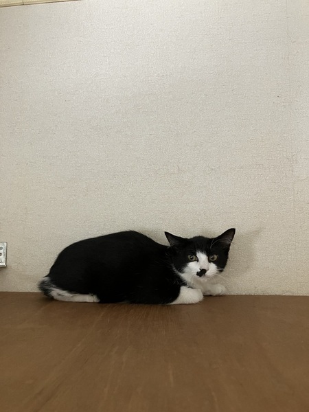 | 特徴(性格など) | 少し臆病な女の子です。 保護して数日は隠れていましたが慣れてきてオモチャにも遠慮がちに手を出すようになってきました。 最近は膝にも乗ってきて甘えるようになりました。 |