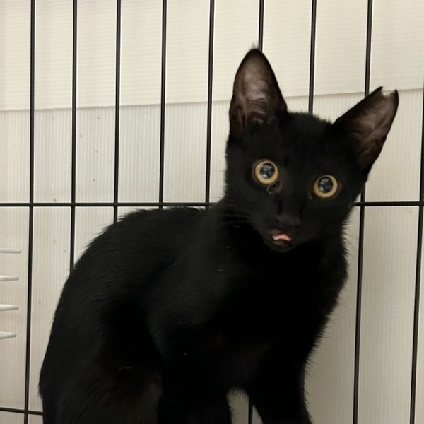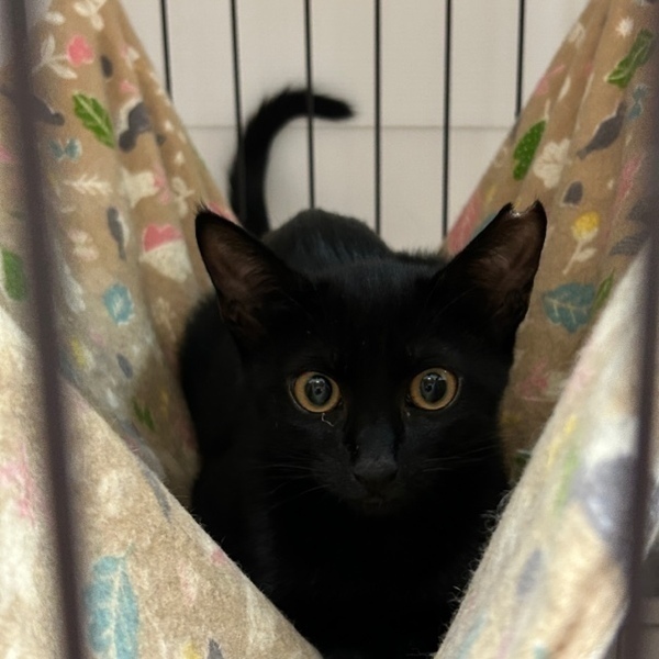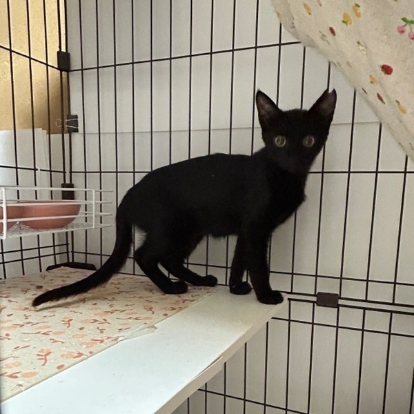 | 特徴(性格など) | ツヤツヤの黒毛、スッとしたお顔、いつもまんまるお目目 スラーリ細く長いしっぽからすぅちゃんと呼んでます。怖がりで遊んでいる兄弟をハンモックから覗いてます。黒猫の魅力満載です。 | ||