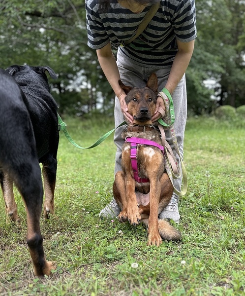 | 特徴(性格など) | 【愛称】ジーク 【犬種】MIX 【性別】オス(去勢済) 【年齢】1歳半(2021年10月頃生まれ) 【毛色】茶黒 【体重】20kg(やや痩せ気味) 【性格】 片耳垂れてるのがチャームポイント!足長でスタイルが良く、ご機嫌な時の笑顔がとっても可愛いのが魅力です。 人との接し方が分からないようで未だに急に近づくと逃げたりハウスに入ったりしますが好奇心もあるため徐々に人間に興味は持ってきている感じです。 怖がって逃げ回ったり固まったりしても攻撃的になることは全くありません。 お散歩にはすぐに慣れ、今ではお散歩行くのを喜んでニコニコで歩きます。 引きは少なく上手に歩きますが知らない人を怖がるので散歩中に声掛けられたり近距離ですれ違う時などは立ち止まる・後退る・逃げ回るなど急に引きが強くなることがあるので注意が必要です。 現在留守番以外はフリーで過ごさせています。室内では、まだ人がいると引きこもりがちなため、人のいない留守時に羽を伸ばして遊ぶ傾向がありイタズラが出始めたため留守番はハウスさせています。 トイレは外派です。預かり当初は時々室内でもしてましたが現在は完全に外のみになりました。 食べることが大好きで、おやつやごはんは積極的にもらいに来ます。 犬には慣れているため他の犬猫との同居可能です。 どんな犬とも平和に交流でき、気が合う犬とは楽しそうに遊びます。音のなるオモチャにも興味を示し投げると咥えて楽しそうにカミカミして遊びます。 経験不足からのビビりな一面はありますが、芯は強い子です。経験を積んでいくことで人との関係を楽しみ信頼していってくれると思いますので、そういう成長過程を楽しみながら一緒に暮らしてくれる家族を希望します。 譲渡範囲は、預かり宅(千葉県佐倉市)から片道90分程度でお届けに行ける地域に限ります。 譲渡の際は誓約書へのサインと医療費の一部負担、お届けにかかる交通費の負担をお願いします。 室内飼育で、脱走・逸走に注意し、室内飼育で家族の一員として大切にしてくださる方からのお問い合わせをお待ちしています。 預かりブログに様子綴っていますのでジークに興味あればご覧ください。 預かりブログ⇒http://blog.goo.ne.jp/on_the-wind |