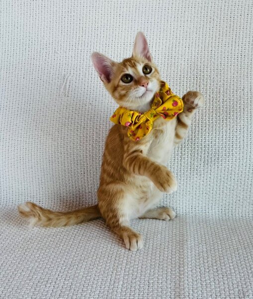 | 特徴(性格など) | 仮名:平太(へいた) 性格は茶トラらしく好奇心旺盛で元気な男の子です。 人も大好きで甘え上手です。 兄弟とのにゃんプロを毎日楽しんでいます。 健康状態 体重 1.20kg(8/22) ウイルス検査は未実施ですが、母猫は検査済、陰性でした。 保護当初はノミ・ダニ、耳ダニ、お腹の虫があって、痩せていました。 8/5にレボリューション塗布、コンベニア(抗生剤)注射。 8/13ドロンタール(駆虫薬)投与。 8/222回目のレボリューション塗布。 今後の医療措置 去勢手術 |