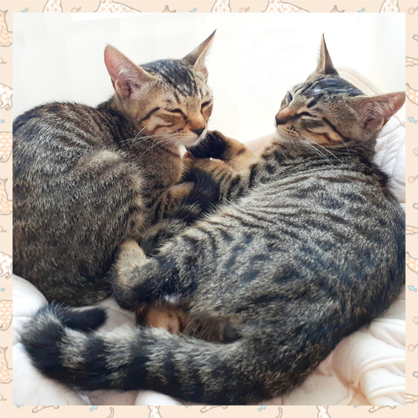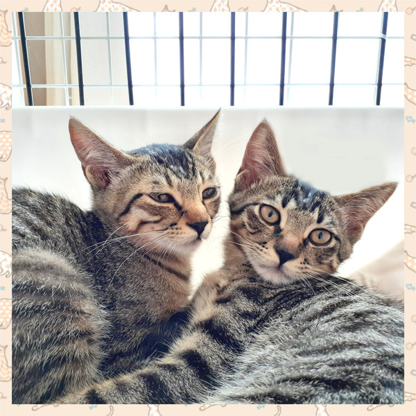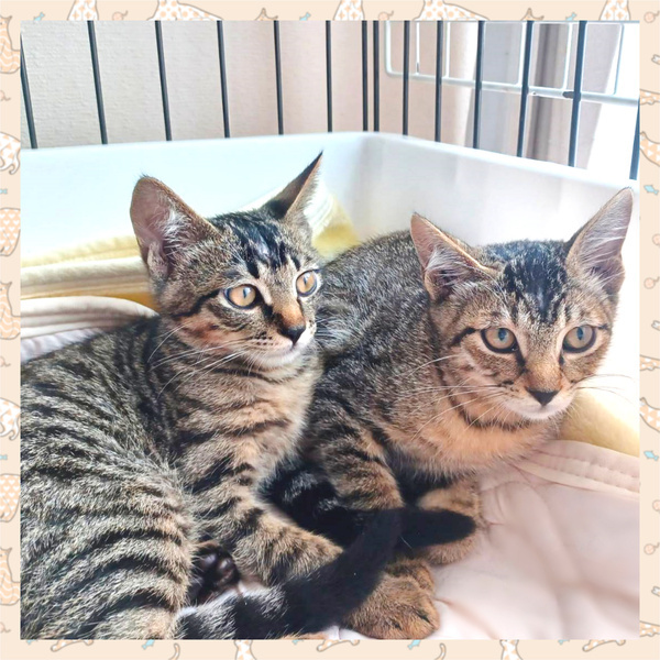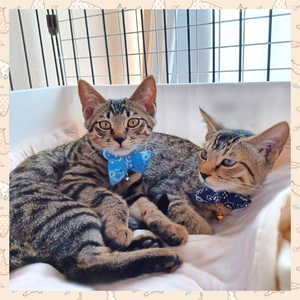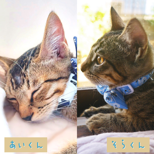 | 特徴(性格など) | 【名前《仮名》】 蒼空《そら》くん 藍《あい》くん 【年齢】4ヶ月 【性別】オス♂ 【体重】 1.95~2.1kg 【柄・色】キジトラ 【特徴/性格】 ■蒼空《そら》くん 【体重】 2.1kg《2023/8/28 時点》 【保護日】2023/8/4 童顔で可愛らしい顔つきの子です。 藍《あい》くんよりも毛色が黒っぽく、 模様がはっきりしています。 性格は愛嬌があり、人懐っこい性格です。 自分より後から保護されて怖がっている 藍《あい》くんの事を 気にかけて側についてあげたりする 面倒見がよいお兄ちゃんな一面も。 保護して数日ですぐに慣れて、 今では喉を鳴らし膝に乗ってきたりとします。 可愛い姿を沢山見せてくれる子だと思います! ■藍《あい》くん 【体重】 1.95kg《2023/8/28 時点》 【保護日】2023/8/12 蒼空《そら》くんよりも毛色が茶色っぽく、 きりっとした顔つきのイケメン君、目も大きい子です。 大人しく、優しい子で弟気質な部分があります。 怖がりではじめは触れせてもらえませんでしたが、 徐々に人馴れしてきて、 最近では膝に乗せて撫でてあげると 喉を鳴らしてくれました! とても仲良しな子たちなので、 兄弟で貰って頂けると嬉しいです! |