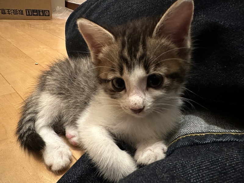 | 特徴(性格など) | キジシロ 動物病院でノミ取りなどの基本的な診察は受けています。 トイレ躾済み。 肩に乗ってくるとても甘えん坊な子です。 |