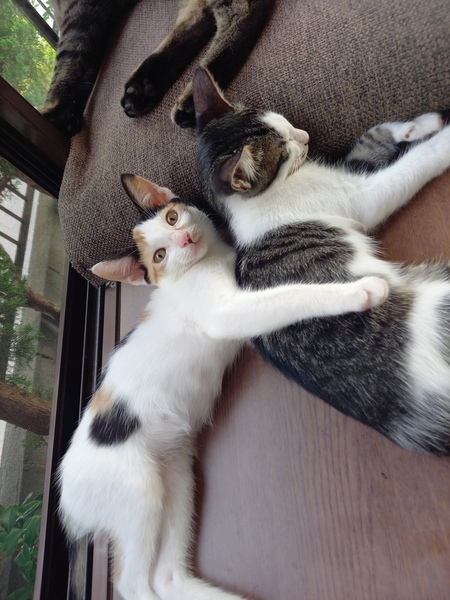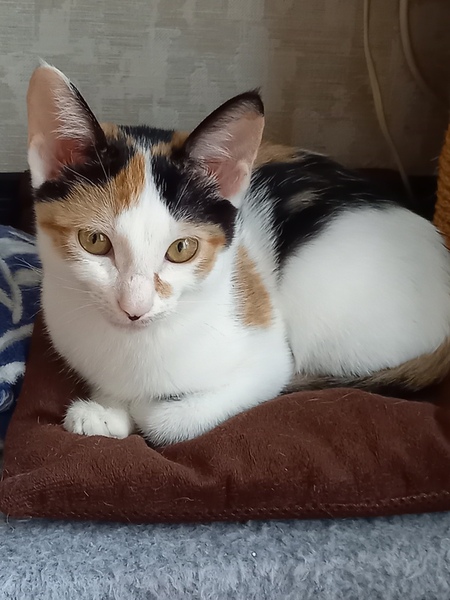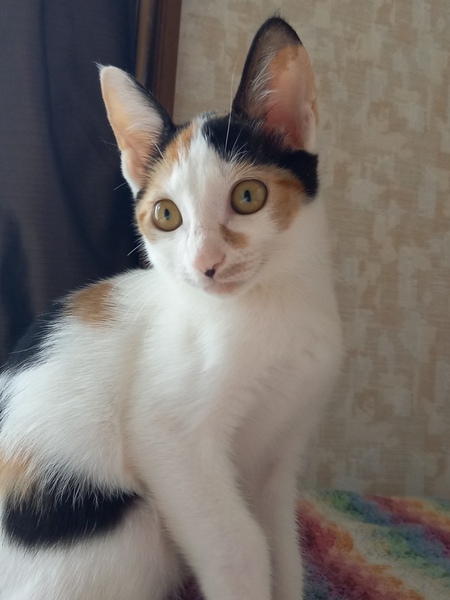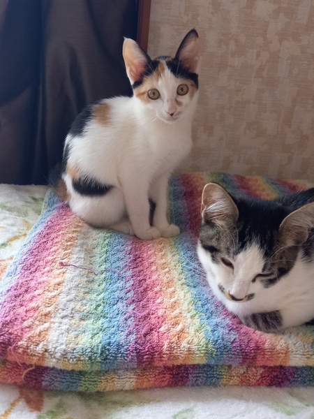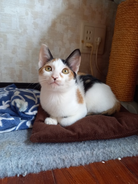 | 特徴(性格など) | しっぽが長い、美人顔の三毛猫です。 感の良い子猫です。 4兄弟で保護しましたが、 一番先にゲージから出て キャットタワーに登り兄弟を誘導したり 空腹になると大声での ご飯の催促は立派です。 最近の彼女のブームは テーブルの上の物を落とし、飼い主の反応を楽しむ事を覚え楽しんでいます。 ワクチン一回 (9/5施行) 寄生虫駆除 FIV(エイズ) FeLV(白血病) 共に陰性です。 排便、尿の状態も良く問題はありません カリカリ、ウエット共に良く食べています。 |