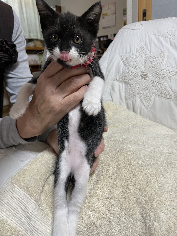 | 特徴(性格など) | 保護された9月5日の体重は150gでとてもちいさく、ガリガリに痩せていたそうですが、歯が生えていたそうですので、推定お誕生日は、8月15日頃かと思われます。 保護されてからは、ミルクや離乳食で少しずつ大きくなり、9月末頃に体重が500gを超えました。 今は、毎日よく食べてよく寝て、すくすく成長中です。 とても幼い頃に保護されましたので、人に対する警戒心はありません。 10月20日にワクチン1回目接種し、血液検査したところ、猫エイズと白血病ともに陰性でした。 また、体重は900gになっていました。 |