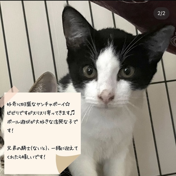 | 特徴(性格など) | 好奇心旺盛、やんちゃな男の子! ボール遊びも大好き? 少しビビりですが甘えて寄ってきます! 兄弟の騎士くんと一緒に迎えてくれたら嬉しいです☺️ |