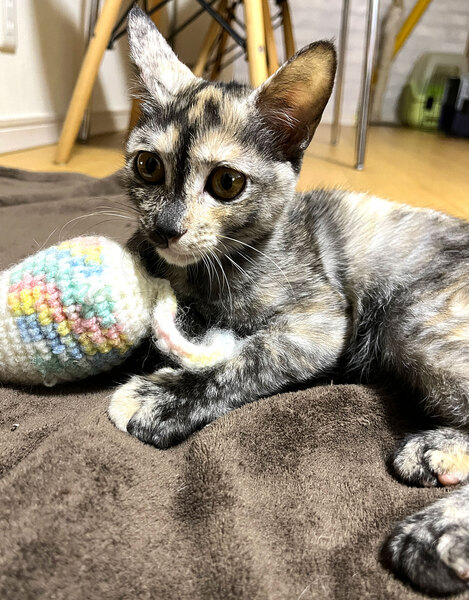| 特徴(性格など) | 天天の特徴はなんと言っても額の「T」マーク! 名前は「Tマーク」にちなみ「天天」になりました。 尻尾はくるっと回っていてうさぎ尻尾です。 体の色は3色(黒・白・茶)のサビ三毛です。 保護されて病院に連れて来られた時には痩せていて、、 ウンチの中身は枯れ葉と土だけだったらしいです;; ひもじかったね;; 何も食べるものがなく、飢えて力なく倒れていたんですね;; 足元がふらふらでまともに歩けない状態だったので レントゲンをとってみたけど骨に異常はなく、、 栄養失調だったと思われます。 病院での2週間の間に順調に回復し、 400g近くも増えて元気になりました? 助けてもらったからか、最初から人を怖がりません。 抱っこができますし、ごろごろ言って膝にのってくれます!! おっとりして、人を大好きな優しい性格なので、 どんなご家庭でも馴染めそうです? 外の世界で取り残されて苦労して来た子ですから、 2度と外で彷徨うことはさせたくないので きちんと脱走対策して下さる 優しい里親さんとの出逢いを求めております。 |