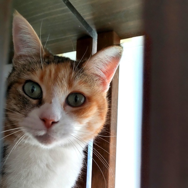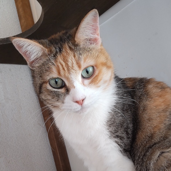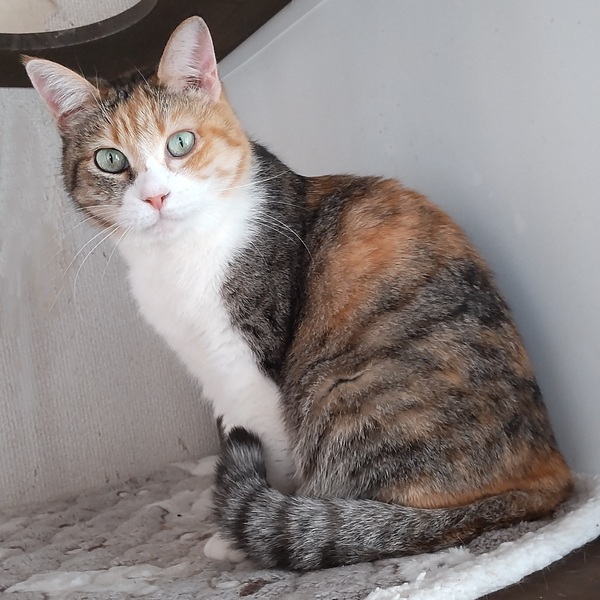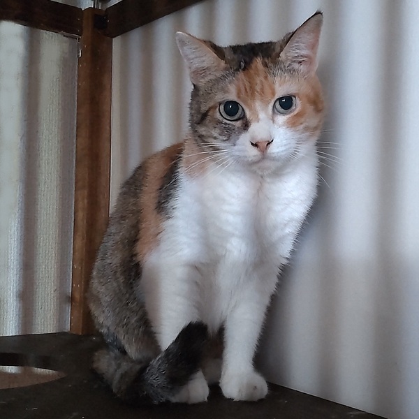 | 特徴(性格など) | 仮名:マイ 毛色:三毛 瞳の色:グリーン 尻尾:長くて先が少しカーブしています。 体重:3.3kg(8月29日現在) 性格・特徴:丸顔にぽっちゃり体型がかわいらしいですが、ちょっと怒っているような表情のマイちゃん。 本当に怒っているのかと思ったら、くつろいでいる時でもこんなお顔です。 元のお家では人が来ない部屋に1匹で引きこもっていたそうで、ねこ窓ハウスに来てからも、うまく身を隠せる場所がなくて居心地が悪そうでした。 出入り自由の大きなケージの最上段に隠れ家を作ってあげると、ほとんどの時間、そこで過ごしています。 環境に慣れるまではこのままでも仕方がないかなと思ったのですが、ずっとシェルターにいるわけではなく、早く本当のお家に行って、それからゆっくりと慣れてほしいと考え、里親募集に踏み切りました。 人と触れ合うことにはまったく慣れていなく、まだ怖がっている様子ですが、最初の数日だけは威嚇が出たものの、その後は仕方なく触られてくれるようになりました。 ひっかきや噛みつきは一度も出ていません。 ほかの猫に対しては意外にフレンドリーで、先住保護猫たちに威嚇やパンチをされてもやり返すことはなく、じっと耐えていました。 1週間ほどすると先住たちとも打ち解け、あいさつしたり一緒にごはんを食べたりできるように。 マイちゃんの隠れ家をたびたび訪れて一緒に寝ている子猫もいます。 先住猫さんがいるお宅でも、攻撃的な子でなければ時間をかけて仲良くなれると思います。 すぐに触れ合える子ではないので、ぜひ人懐っこい子とペアでお迎えください。 飼い主さんの気持ちを思うと、一緒に保護されたモモくんと2匹で暮らせるのがベストなので、モモくんと一緒に迎えていただける方を優先させていただきます。 システムトイレも固まる砂のトイレも問題なく使っています。 健康状態:猫白血病、猫免疫不全ウイルスともに陰性。 ノミ・ダニ・お腹の虫の駆除済み。 保護時、お腹にノミアレルギーと思われる脱毛と湿疹がありました。 ノミ駆除により治癒していくものと思われますが、念のため経過観察をお願いします。 |