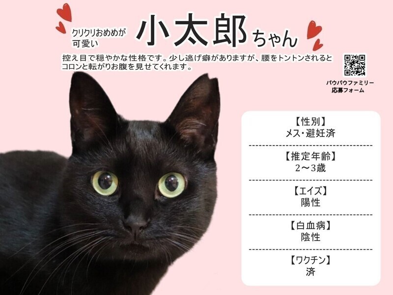 | 特徴(性格など) | 【仮名】小太郎♀ 【生年月日】推定3歳 【性別】メス 【ワクチン】3種混合ワクチン済み 【避妊】済み 【駆虫】済み 【猫エイズ・白血病】猫エイズ陽性 ※猫エイズについてストレスなく穏やかに過ごさせてあげる事により寿命をまっとう出来る子が多いです。発症しなければ普通の猫と何も変わらず、普段のケアは特に何も必要ありません。 穏やかな暮らしをこの子に与えて下さる優しい飼い主さまを探しております。 【性格】穏やかで控えめな性格です。人や他の猫に対しても優しく、ごはんやオヤツ、オモチャで遊ぶ時なども常に一歩引いて静かに順番待ちをします。撫でられるのが好きで抱っこもOK。お腹を見せてコロンと転がって撫でて下さいと可愛く催促します(笑) 動画です。 ↓ https://www.instagram.com/tv/CL-VRtXBBa8/?igshid=1rjm2dcfi4n0p https://www.instagram.com/p/CM54hnvBll_/?igshid=4tl45n3arqj1 |