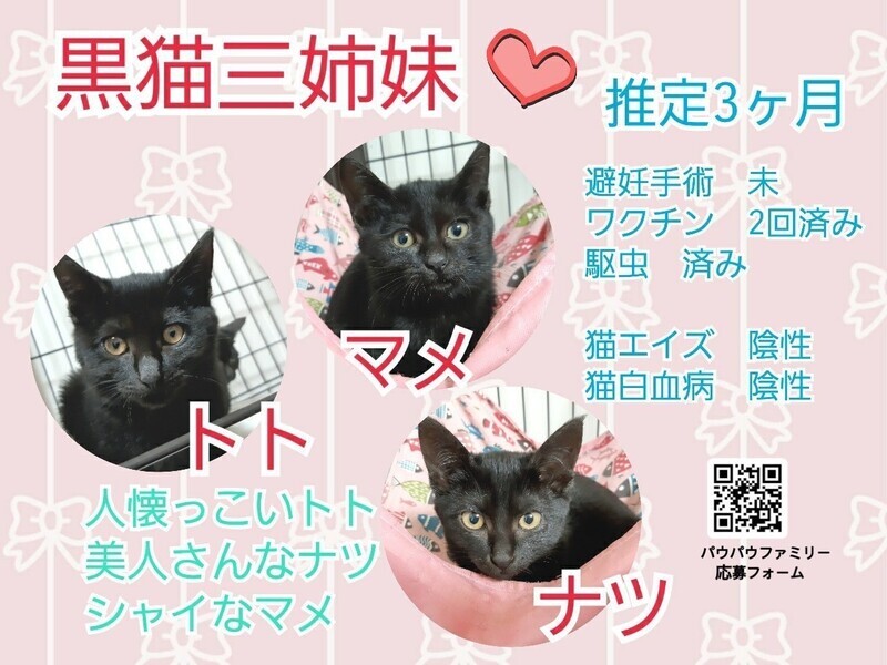 | 特徴(性格など) | 【仮名】ナツ 【年齢】推定2023年8月生まれ/黒猫3姉妹 【性別】メス 【ワクチン】2回済み 【避妊手術】未(適齢になり次第飼い主さまでお願い致します。) 【駆虫】済み 【猫エイズ白血病】どちらも陰性 【性格】お母さんに似て小顔で美人さんです。全体的にシャイな印象ですが抱っこや爪切りは出来る良い子で、子猫にしては落ち着いていて飼いやすい子だと思います。子猫なので環境にもすぐ慣れて家庭猫として素敵なパートナーになれると思います。 |