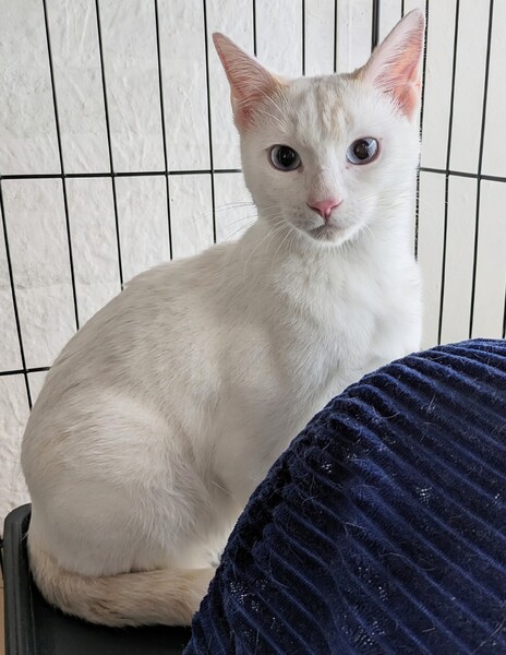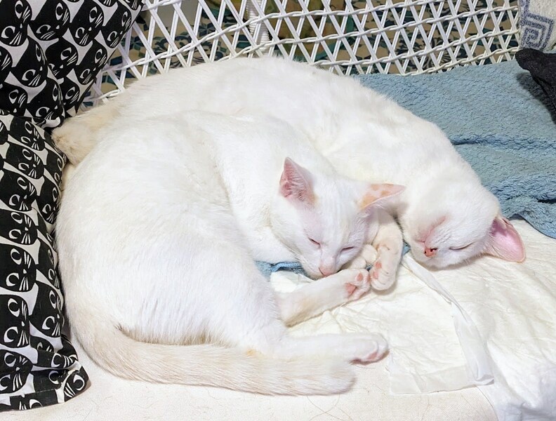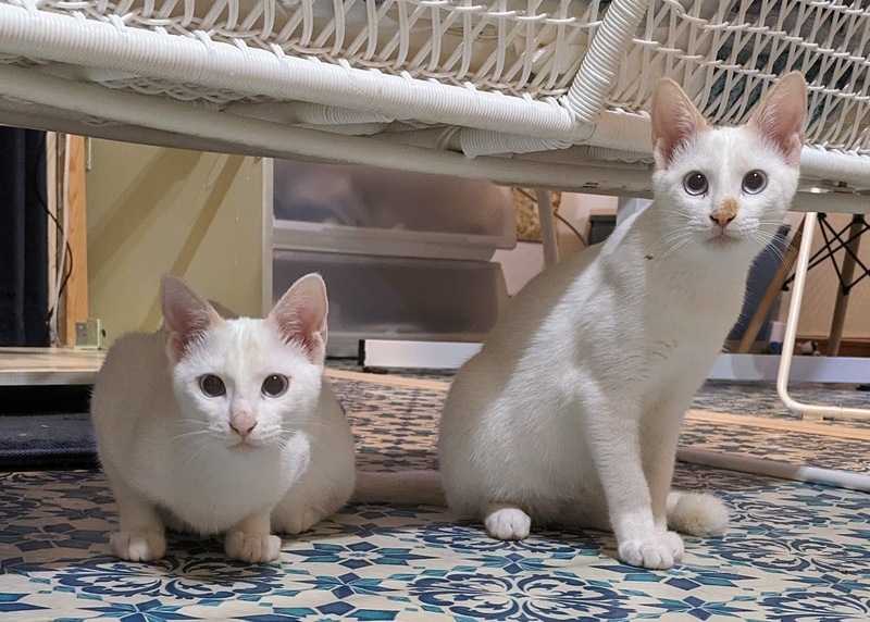 | 特徴(性格など) | 白猫 少し薄茶色の柄あり かなり活発です。 一匹はかなり人懐こく、撫でてほしくてストーキングしてきます。 一匹はまだ少し慣れていません。 攻撃性は一切なく、撫でれば気持ち良さそうにしていますが、撫でようとするとまだ逃げます。 とても仲良しの兄弟でいつもくっついて寝ています。 ずっと2匹一緒に居てほしいと思っています。 |
