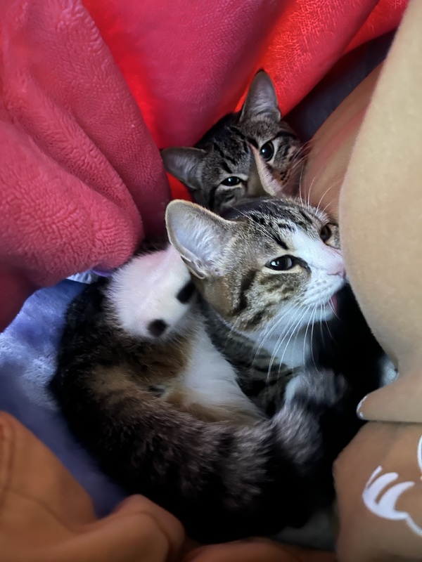 | 特徴(性格など) | 虎柄≫去勢手術済み、雄猫、人懐っこい、兄弟猫と一緒に現在住んでいるがよくじゃれて遊んでいます、台所へ出入り出来る環境で育てる場合は食べ物とかを食べてしまう可能性がある為対策が必要です、高いところ大好きです 虎柄顔周りや身体白もあり≫未不妊、メス猫、ビビリな性格で現在募集しているオス猫と母猫と同じ部屋で過ごしていますが、リビングへ連れて行こうとすると犬2匹がおり、警戒し行こうとしません、猫の多頭飼いなら大丈夫だと思いますが犬との多頭飼いは厳しいと思います、人間へ甘えたりします寝るときは布団に入ってきます、未不妊と言うこともあり、いま時期発情しています、引取後は不妊治療宜しくお願いしたいです |