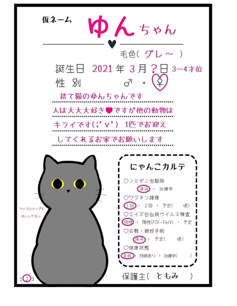 | 特徴(性格など) | ★仮ネーム: ゆん ★性別: 女の子 ★月齢: 3~4才 ★性格: 人は大大大好きですが、他の動物がキライです(・・;) なので、、、ゆんちゃん一人で過ごせるオウチでお願いします ほど良~~~くスリゴロ甘えん坊さん♪ 大人ネコさんなので落ち着いたニャンコとの生活をすごせます ブリティッシュ?スコ?? 捨て猫さんなので不明ですが まん丸頭やお目メがとってもかわいいで~す❤ 【医療処置】 検便︰済 ノミダニ虫駆除︰済 3種混合ワクチン ︰済 エイズ白血病ウイルス血液検査︰陰性 去勢避妊手術︰済 健康状態︰良好 マイクロチップ挿入済 |