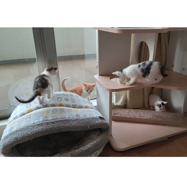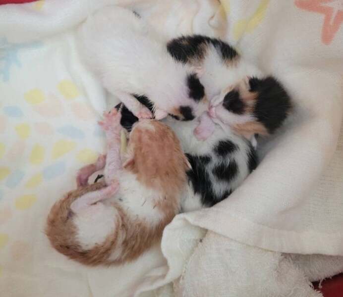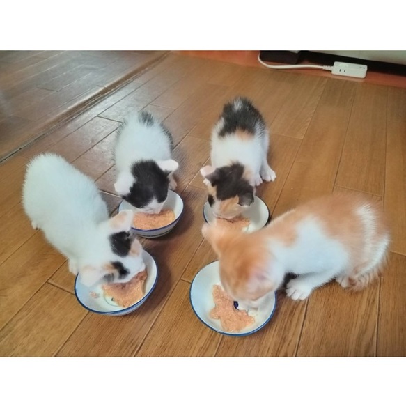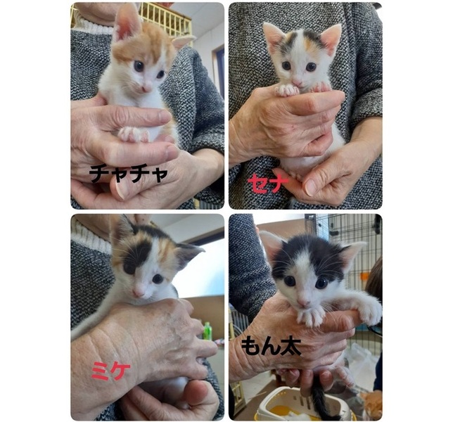 | 特徴(性格など) | ミケのミケちゃんと白ミケのセナちゃんがメス、 茶白のチャチャちゃんと白黒のもん太ちゃんがオスです。 ノミ取りと駆虫は済ませました。 生後1か月半くらいとまだ小さいのでウイルスチェックとワクチン接種はできませんが、食欲旺盛、元気いっぱいです。 |