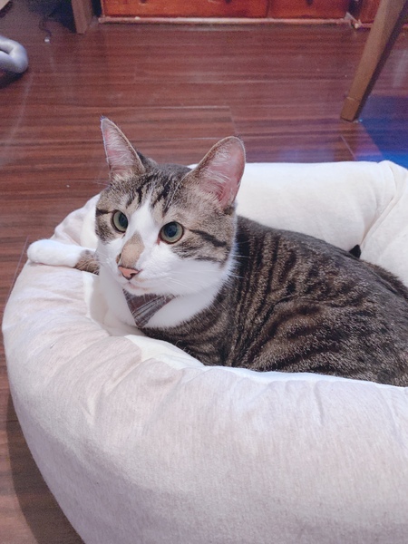 | 特徴(性格など) | 甘えん坊のサバトラ かなり人が好き、おとなしい、膝の上が好き、寂しがりや、生まれつき目が寄っている(受診済み、特に心配なし) |