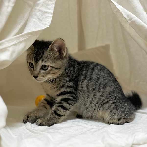 | 特徴(性格など) | コロコロと丸くて大きな体ですが、誰よりも怖がりな男の子。怖がってシャーと言いますが、手が出ることはない優しい猫です。マイペースで一人でにゃんモックで寝るのがお気に入り。 短めのカギ尻尾とコロコロ丸い体がチャームポイントです。大きめの猫さんに成長すると思います。 かなりの怖がりなので、ゆっくり仲良くなっていく過程を楽しめる方を希望します。 猫とも仲良くできると思いますが、遊び相手は必須ではありません。 |