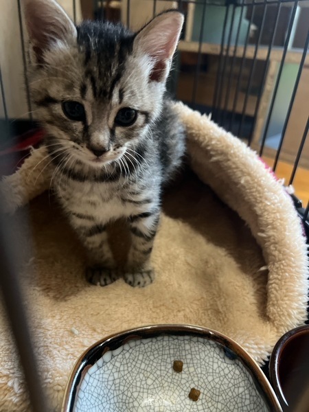 | 里親募集する理由 | 保護した日 5月23日 保護している場所 福岡市西区 保護に至った経緯 家の裏の道路でカラスにつつかれている子猫を見つけたためカラスから助けて自宅に保護しました。 とても可愛い子なのでうちで飼ってあげようかとも思いましたが、先住猫が2匹おり、 私自身もシニア世代に入ったため、今から15年~20年生きるこの子の事を考えると、 若いご家族の元で幸せになって欲しいと思い里親募集をすることにいたしました。 保護した時の様子 怖い思いをしたからか、かなり怯えていたようで、保護した当時はシャーシャーと一生懸命威嚇していました。 そのまますぐに動物病院へ行きましたが、幸運にも外傷は全くありませんででした。 ノラちゃんにしては体格もまぁ良くて、多分お母さん猫のオッパイをしっかり飲めていたのだろうとのこと。 母猫と離れ、小さい身体で必死に頑張っていたのだと思いました。 最初はまだ小さくてカリカリフードだけでは食べられなくてウエットフードだけをあげていましたが、 その後は少しずつウエットフードと一緒にカリカリフードを混ぜて食べさせ、今はカリカリフードだけでも大丈夫になりました。 仕事で家にいない間はケージに入れてますが、帰ってからケージから出すと、 もう半端ない勢いで部屋を走り回り、歩いていても脚にまとわりついてきます。 最初からトイレはちゃんと猫砂にしてくれていて、一度も失敗はありません。 本当に元気でやんちゃな子猫ちゃんですので、この子は1匹よりも、 若い先住猫ちゃんがいるところの方が社会性も身について2匹で遊んでくれると思います。 この子の先々を考えて大切に育てて下さる方を探しています。 どうぞよろしくお願いいたします。 |