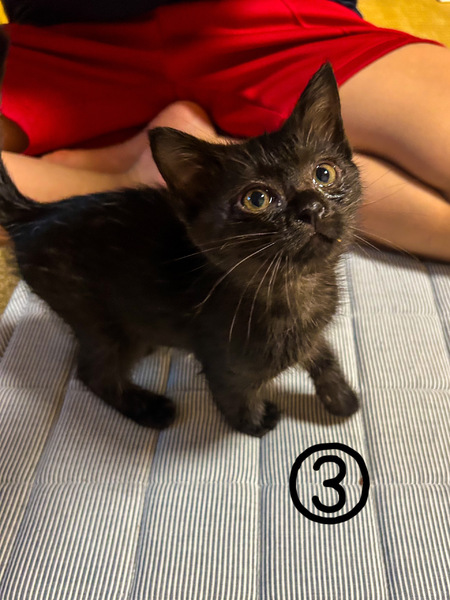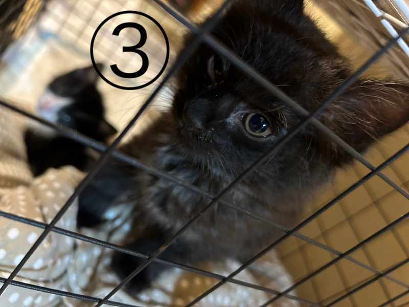 | 特徴(性格など) | ①黒(グレーに近い)オス:人懐っこい甘えん坊。元気に遊びます。短シッポ。毛長。 ②白黒オス:人懐っこい。鍵シッポ。元気です。 ③黒メス:小柄ですが元気です。鍵シッポ。 |